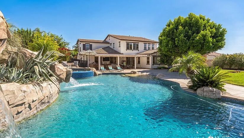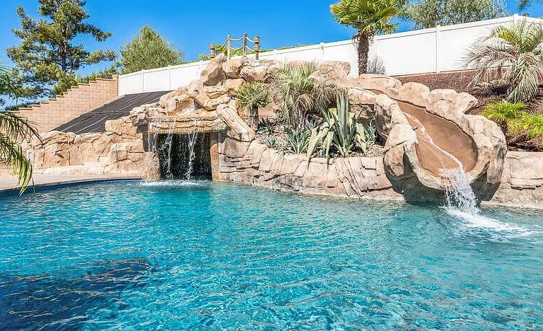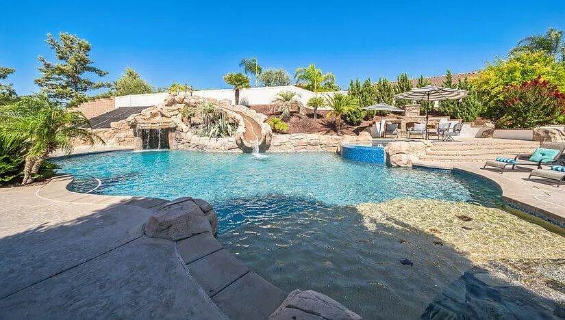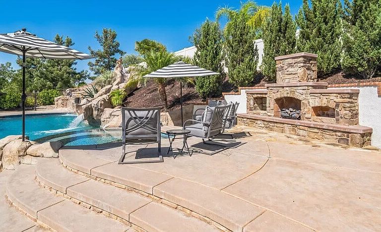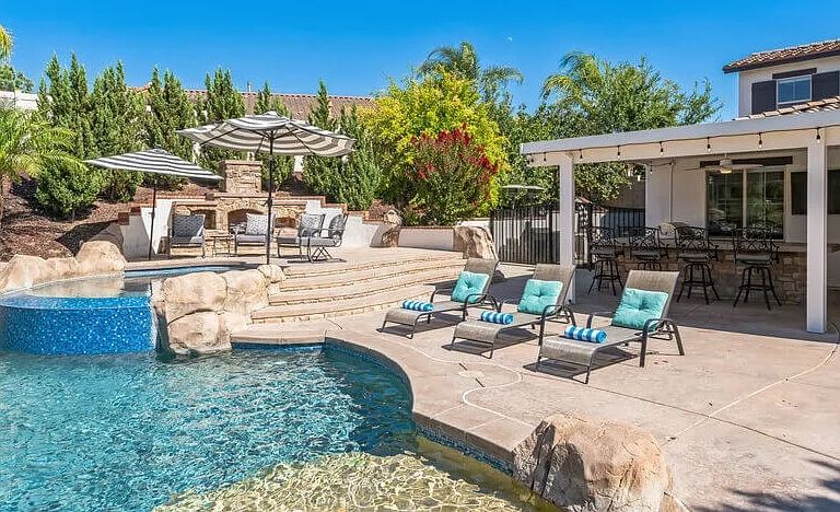 The furnished rental in Temecula’s true highlight is its backyard, a private oasis designed for relaxation and enjoyment. The resort-style pool, with a built-in rockslide and large grotto, invites endless fun and adventure. Unwind in the 10-person jacuzzi hot tub or gather around the outdoor fireplace for cozy evenings.