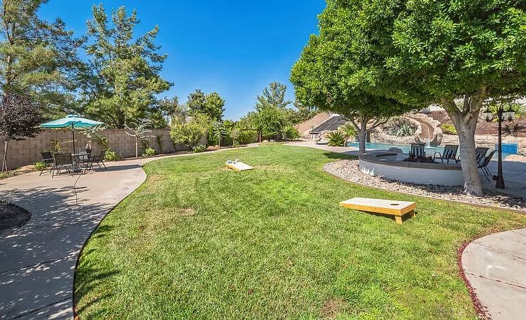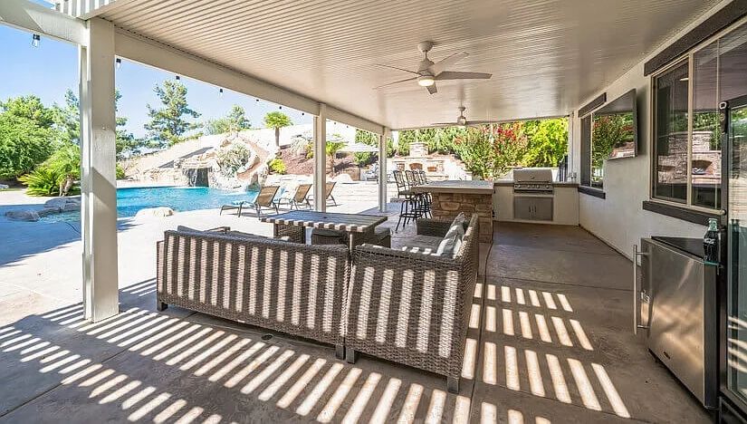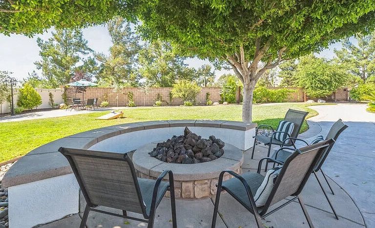 The backyard includes a dining area, an outdoor BBQ island with a Traeger smoker, and a Blackstone grill, perfect for hosting outdoor meals and celebrations. It’s an excellent space for all sorts of events and celebrations while you explore the area’s beauty.
