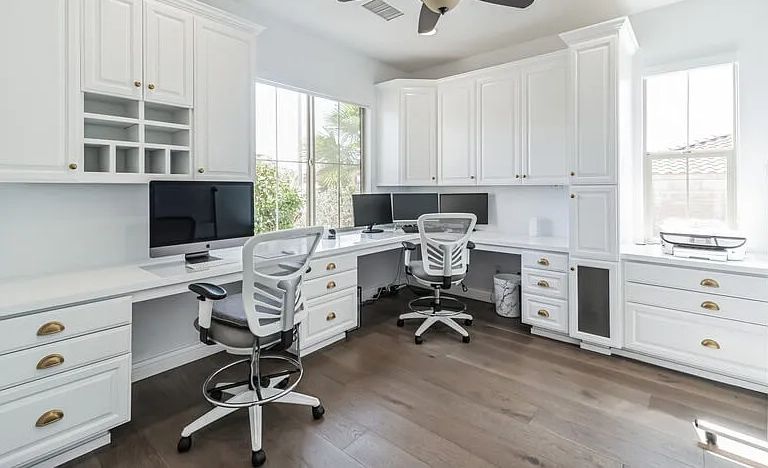 The adjacent dining area and expansive living room provide a seamless flow for gatherings and everyday living. For those who work remotely, the home boasts a large office with two workspaces and high-speed internet, ensuring you have everything needed for productivity.
